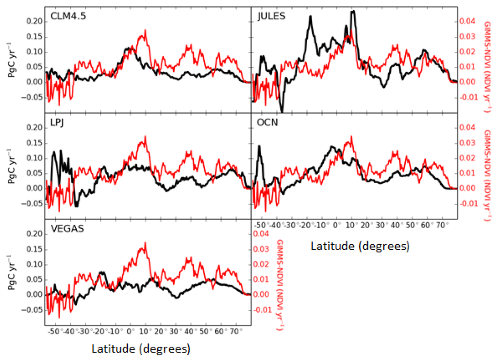 A latitudinal comparison between NDVI and simulated NPP trends for the five TRENDY models.