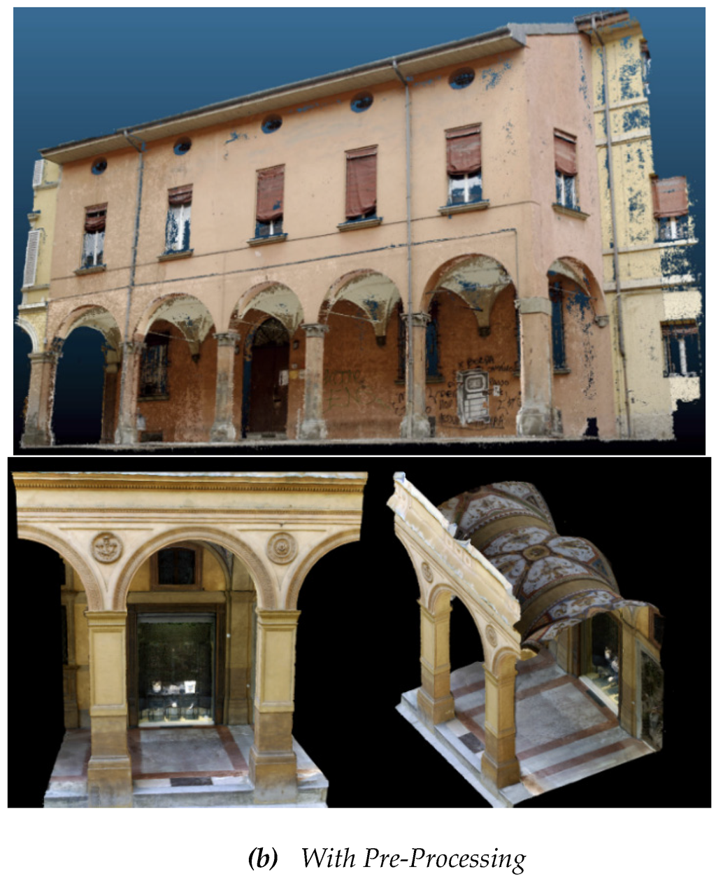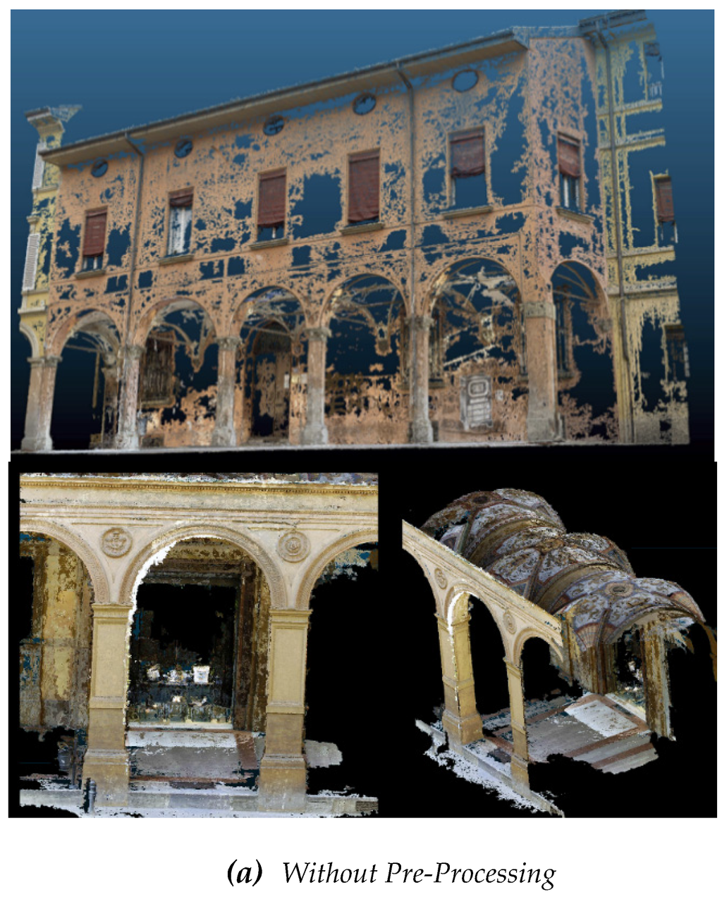 3D reconstruction of complex architectures without (a) and with (b) a suitable pre-processing methodology applied to improve the radiometric image quality and provide more complete and noise-free 3D point clouds.