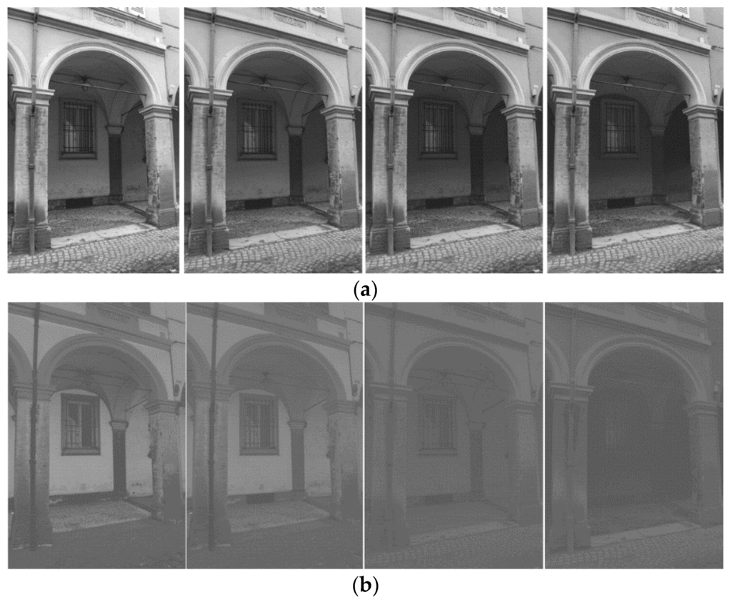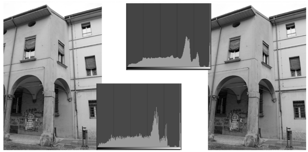 Image pre-processing is a set of methods used to increase the quality of images for successive processing purposes [9]. The aim is thus to enhance some image features important, e.g., for 3D reconstruction algorithms or to remove unwanted disturbs or degradations in the image. A pre-processing can be a simple histogram’s stretching or a more complex approach like denoising or filtering [10,11]. Image pre-processing normally comprises enhancement (i.e., the improvement of the image quality) and restoration (i.e., the removal of degraded areas). The former is more subjective, whereas the latter is an objective process that involves the modeling of degradation (possibly from prior knowledge) and applying an inverse process to recover the original signal. Image pre-processing is a fundamental task for many successive tasks in applications like medical imaging [12], computer vision, underwater photogrammetry [13] or 3D modeling [14].