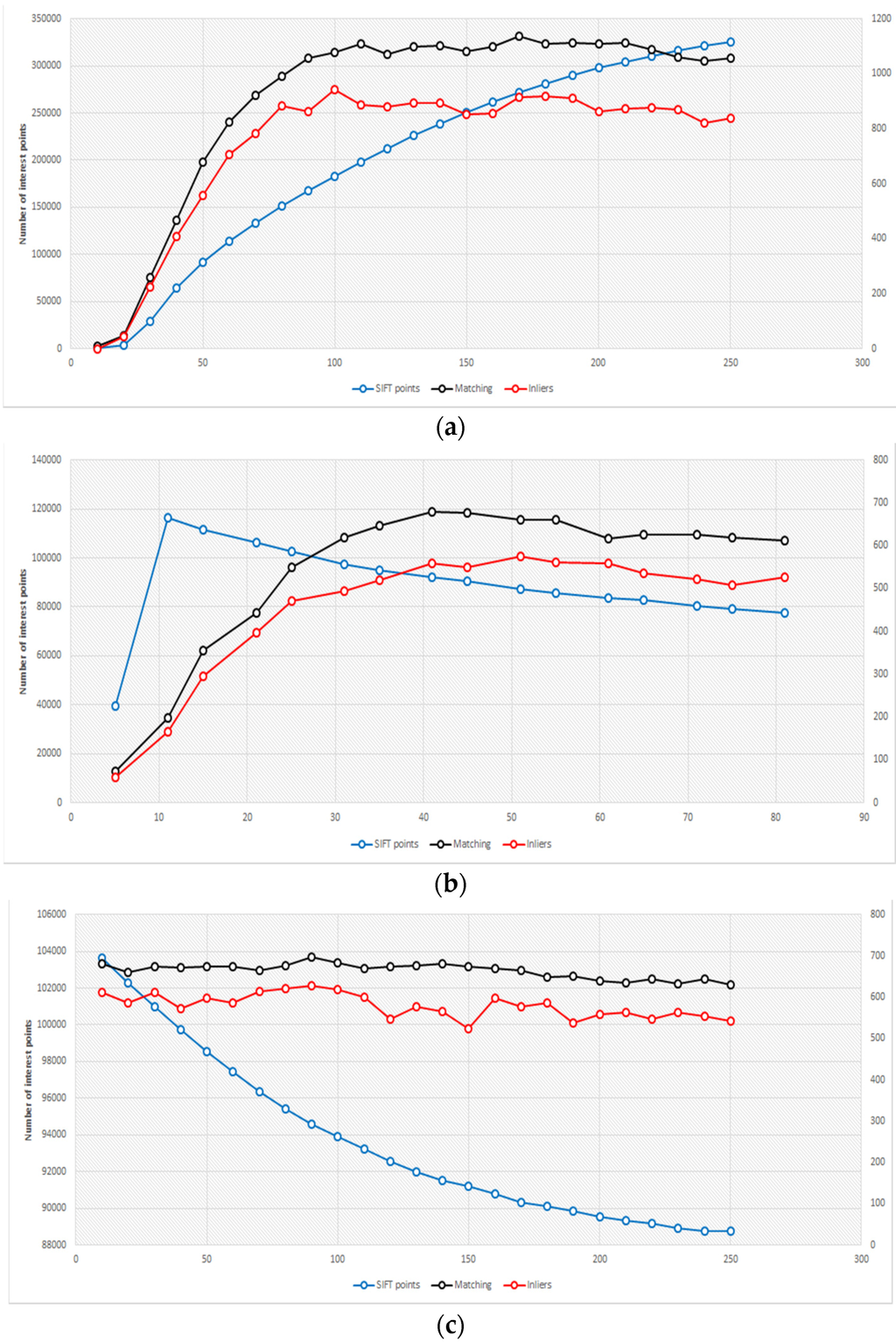 Most of the algorithms involved in the image-based 3D reconstruction pipeline (mainly feature extraction for tie points identification and dense image matching) are conceptually designed to work on grayscale images (i.e., single-band images) instead of the RGB triple. This is basically done to highly reduce the computational complexity of the algorithms compared to the utilization of the three channels. Color to grayscale conversion (or decolorization) can be seen as a dimensionality reduction problem and it should not be underestimated, as there are many different properties that need to be preserved. Over the past decades, different color-to-gray algorithms have been developed to derive the best possible decolorized version of a color image [20]. All of them focus on the reproduction of color images with grayscale mediums, with the goal of: (i) a perceptual accuracy in terms of the fidelity of the converted image; and (ii) a preservation of the color contrast and image structure contained in the original color also in the final decolorized image. Nevertheless, these kinds of approaches are not designed to fulfill the needs of image matching algorithms where local contrast preservation is crucial during the matching process. This was also observed in Lowe [50] where the candidate key points with low contrast are rejected in order to decrease the ambiguity of the matching process.