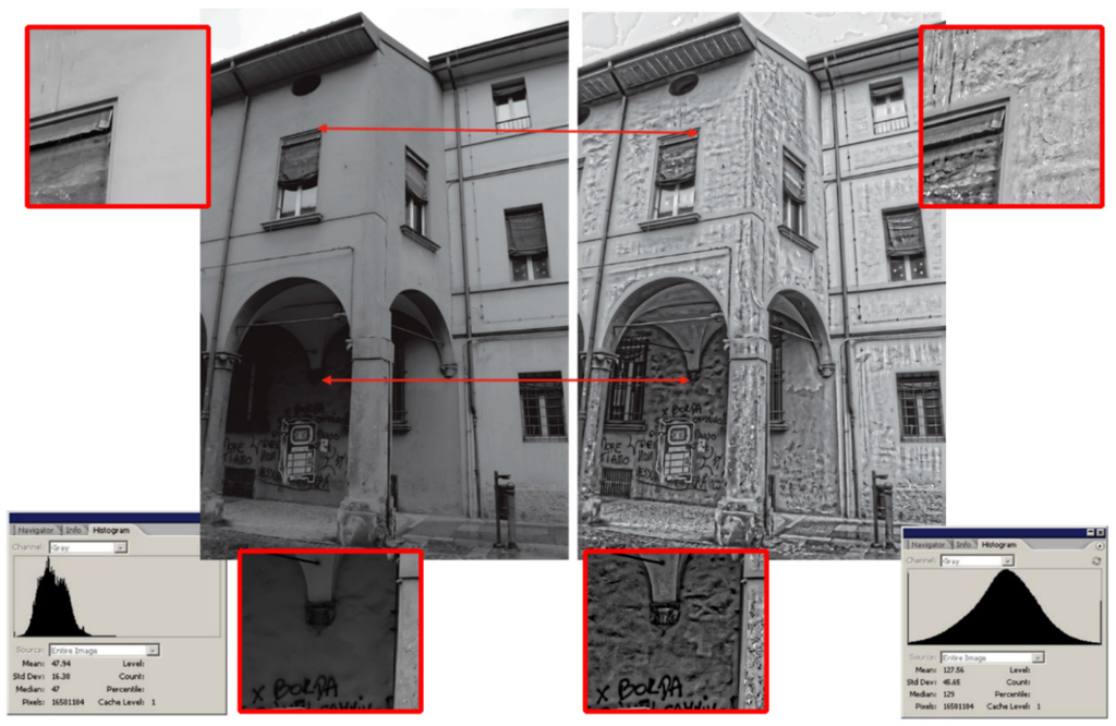 This paper presents an efficient image pre-processing methodology developed to increase the processing performances of the two central steps of the photogrammetric pipeline, i.e., image orientation and dense image matching. The main idea is to minimize typical failure caused by Scale-Invariant Feature Transform (SIFT)-like algorithms [7] due to changes in the illumination conditions or low contrast blobs areas and to improve the performances of dense image matching methods [8]. The methodology tries to: (i) increase the number of correct image correspondences, particularly in textureless areas; (ii) track image features along the largest number of images to increase the reliability of the computed 3D coordinates; (iii) correctly orient the largest number of images; (iv) deliver sub-pixel accuracy at the end of the bundle adjustment procedure; and (v) provide dense, complete and noise-free 3D point clouds (Figure 3). The work investigated various state-of-the-art algorithms aiming to adapt the most promising methods and give solutions at the aforementioned specific problems, thus creating a powerful solution to radiometrically improve the image quality of an image datasets. The developed procedure for image pre-processing and enhancement consists of color balancing (Section 2), image denoising (Section 3), color-to-gray conversion (Section 4) and image content enrichment (Section 5). The pre-processing methodology could be really useful in the architectural, built heritage and archaeological fields, where automated 3D modeling procedures have become very common whereas skills in image acquisition and data processing are often missing. Our methodology could even be embedded in different types of processing scenarios, like completely automated web-based applications (e.g., Autodesk ReCap and Arc 3D Webservice) or offline desktop-based applications (e.g., Agisoft Photoscan, Photometrix iWitness, VisualSFM, and Pix4D Mapper).