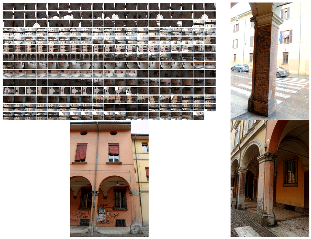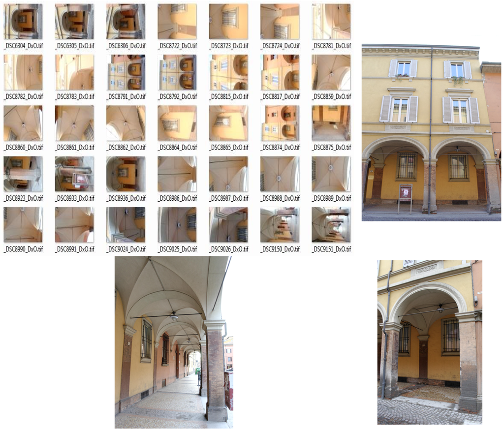 The last dataset (265 images acquired with a Nikon D3100, sensor size 23.1 × 15.4 mm, 18 mm nominal focal length) regards a three floors historical building (19 m height × 10 m width), characterized by arcades with four arches, columns, cross vaults and plastered walls with uniform texture. The camera was moved along the porticoes, with some closer shots of the columns and of the vaults (Figure 13). The dataset is used to show how the various steps of the proposed pre-processing pipeline positively influence the 3D reconstruction procedure. Table 7 reports the achieved image orientation results without and with pre-processing. The developed methods (CBM3D-new for the noise reduction and BID for the color-to-gray conversion) allow orienting larger numbers of images.