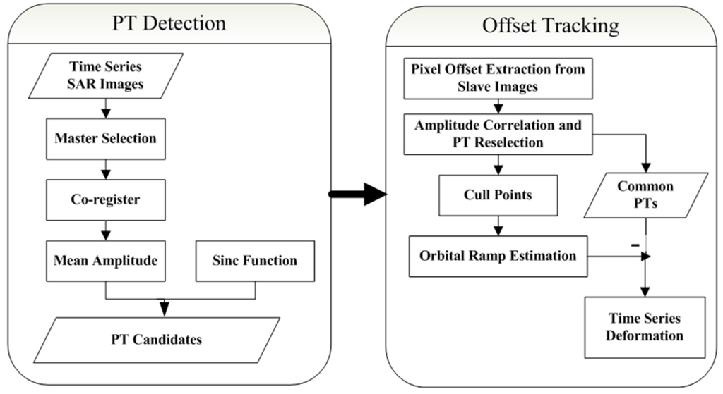 In our previous study, a modified POT technique was employed to detect the deformation at the Shuping landslide area [22]. Two stacks of TerraSAR-X datasets acquired from 2008 to 2010 were analyzed to characterize the historic evolution of the Shuping landslide. In this study, corner reflectors installed at/near the landslide zone were utilized as PTs to analyze the spatial-temporal pattern of landslide deformations. Consequently, displacement measurements at these PTs were reasonably considered as a surrogate for local landslide deformations and adopted in a response analysis. The process flow of our proposed POT is illustrated in Figure 1—the details of this technique can be found in [22].