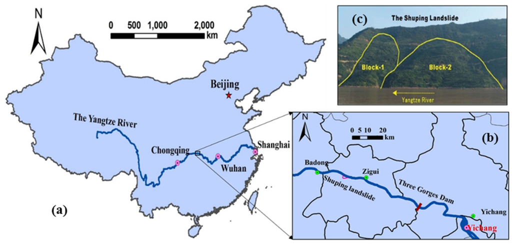 Location of the Shuping landslide in China (a,b) and a photo of Shuping landslide taken from opposite bank facing south (c) [22].