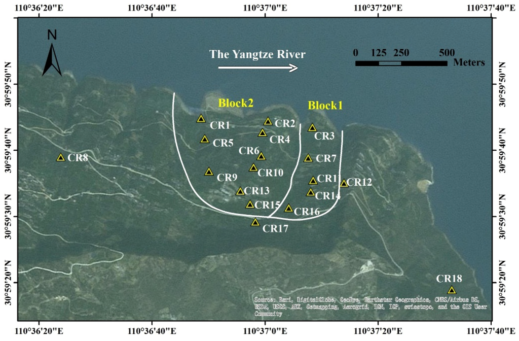 From Figure 4 we can see that in the past, a valley has divided the Shuping landslide into eastern Block 1 and western Block 2 portions. Since 2005, 18 corner reflectors have been installed sparsely at Shuping landslide to help understand the landslide evolution [53,54], as presented in Figure 5. Out of the 18 corner reflectors, four (CR8, CR13, CR17, CR18) showed up only on images acquired after 24 January 2009. Among them, corner reflector CR12 is located on a stable area outside but adjoined to the landslide and thus was used as a reference point [50].