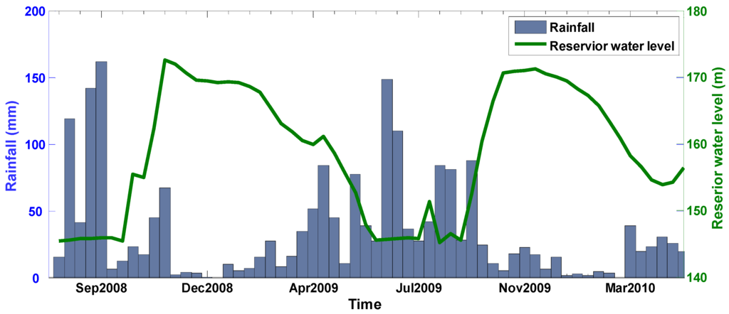 The daily reservoir water level was available for the period of June 2008 to May 2010. In November 2008, the TGR had become fully operational when its highest water level reached 175 m. Since then, reservoir water level fluctuates between 145 m and 175 m over the course of a year. These seasonal changes in water level exhibit clear seasonal changes due to artificial flood control [55,56].