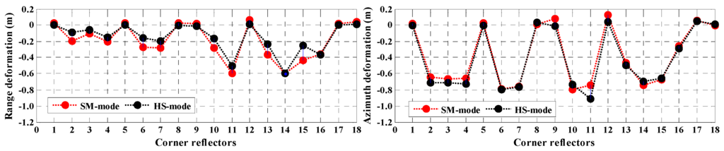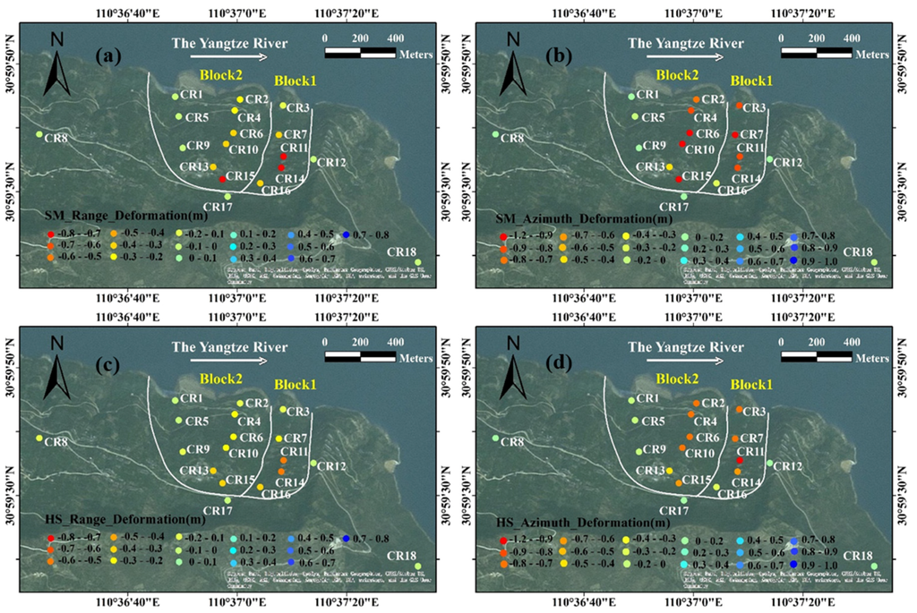 As can be seen in Figure 7 and Figure 8, three CRs, namely CR8, CR17 and CR18 are located on a stable region outside the landslide area, and remained stable over a long period of nearly two years. The cumulative displacements derived from both HS and SM stacks are not more than 0.1 m. These results are reasonable and agree with the actual situation, which confirms the reliability of POT in deformation monitoring. The distribution of displacement derived from HS and SM data are almost identical in both azimuth and range at same locations, although the HS mode starting acquisition date was seven months later with a 15° difference in look angle compared to the SM mode.