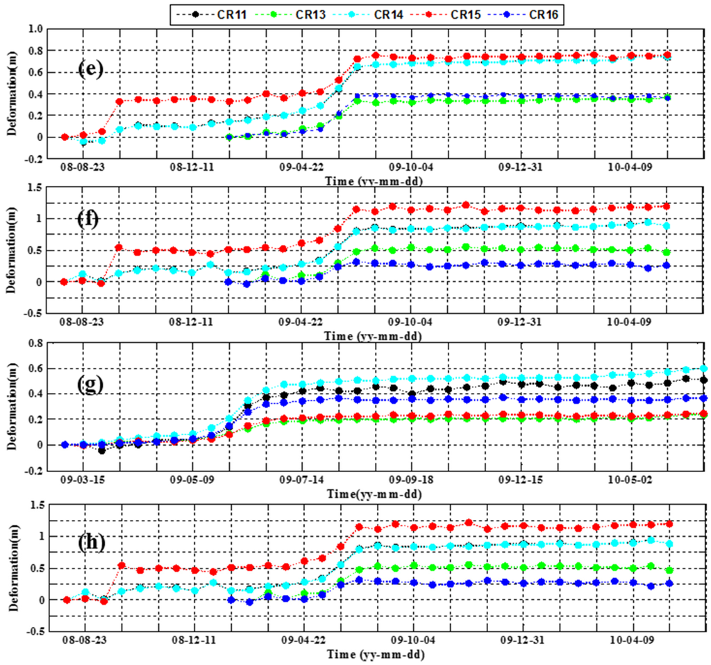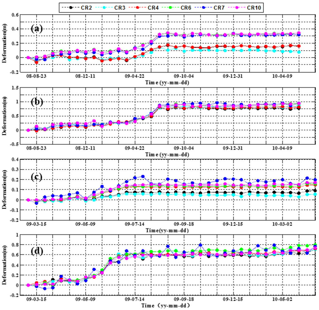 As shown in Table 2, the other fourteen corner reflectors installed at the slide are artificially categorized into three groups, considering their geographic locations and evolution features. The CR1, CR5 and CR9 corner reflectors located in the western part of Block-2 were assigned in group 1. As can be seen in Figure 7 and Figure 8, displacements in this group were 0.1 m at the most, from which it can be inferred that the western part of Block-2 was in a rather stable state from July 2008 to May 2010.