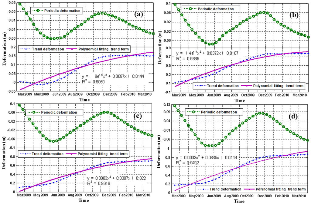 The moving average method is believed to be an effective way to reduce the short-term uncertainty caused by random disturbances and highlights longer-term cycles or trends [41,42]; thus, it was applied to the displacement time-series derived from the SM stack. The time intervals for the moving average method, were set at less than the cycle of the periodical factors to protect the seasonal signal from damage. In this study, 16 historical series of displacements before 15 February 2009 in the SM stack were set as the first moving window to conduct the moving average analysis, roughly one half-cycle of the hydrological factors (approximately one cycle occurs per year). However, the HS stack derived deformation time-series has only one complete cycle (one cycle per year) during the period from February 2009 to April 2010. Therefore, it was impossible to use 16 historical series observations to conduct the moving average analysis and at the same time obtain a complete period for the cyclical variation of displacement. An alternative de-noising method must be found.