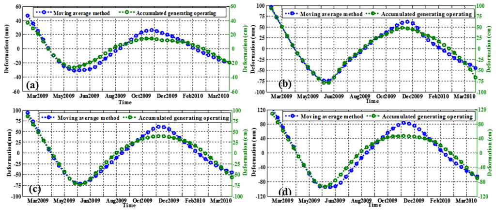 As discussed in Section 2.2, the moving average method is the ideal method for eliminating the short-term uncertainty caused by random disturbances; however, it is a calculation from a moving window with 16 historical series observations, and infeasible for measurements from a HS stack, since it has only one complete cycle (approximately one cycle per year) from February 2009 to April 2010; otherwise, we could not obtain one complete period of the cyclical variation of displacement. Thus, AGO was adopted as an alternative to weaken the random disturbances from SAR derived displacements.