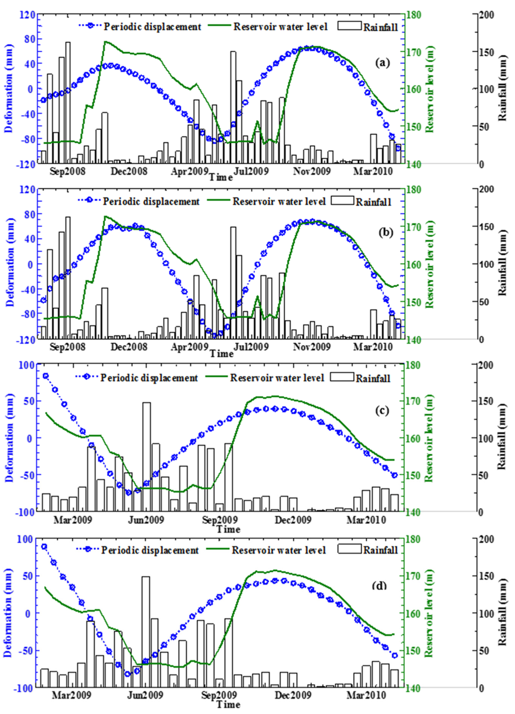 In our previous study [22], we demonstrated that the total deformation was affected by the drawdown of the water level from April to June, but not by the sharp rise of the water level in October. From Figure 13, the water level rose rapidly from 145 m to 170 m during September to November both in 2008 and 2009. The change in deformation was very small, however, especially after excluding the effects of precipitation. Conversely, a very large deformation gradient occurred when the reservoir water fell quite rapidly from 170 m to 145 m in the period of November to April in both 2008 and 2009.