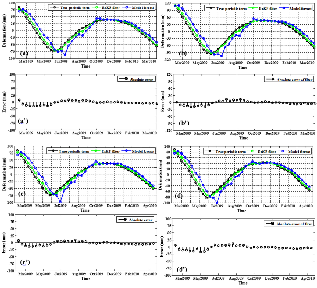The assimilation and simulation results after the parameters were optimized for the periodic motion of the CR14 corner reflector in both range and azimuth from February 2009 to April 2010 are shown in Figure 14. These figures show that, as the assimilation is progressing, the data assimilation estimates provided good representation of the SAR derived displacements and the optimized parameter simulation results become more reliable than the testing results after running a few steps. The mean absolute error of the assimilation results were shown in Figure 14. We can see that at the beginning of data assimilation, the estimation error of EnKF was relatively high with maximum error at approximately 25 mm, but, after a few steps forward, it decreased gradually. However, it could not reach zero due to either the incomplete parameters or the observation errors already incorporated in the dynamic process.