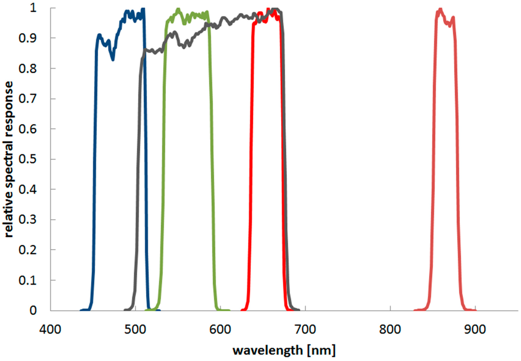 Figure 1. Landsat 8 spectral response functions for the blue, green, red, panchromatic (black) and near-infrared (NIR) (dark orange) bands.