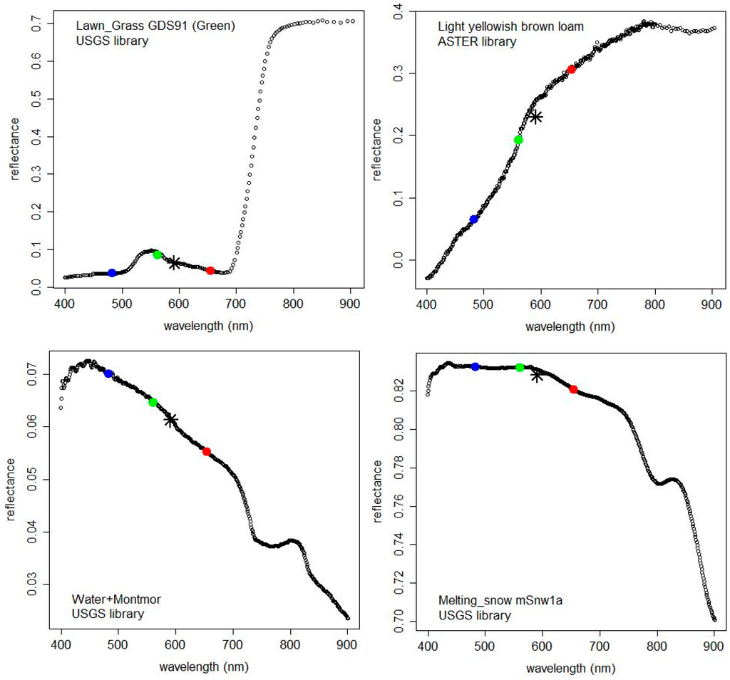 Figure 2. Example vegetation, soil, water and snow spectra and the simulated (see Equation (3)) panchromatic (black asterisk), red (red dot), green (green dot), and blue (blue dot) Landsat 8 Operational Land Imager (OLI) reflectance plotted at the Landsat 8 band center wavelengths.