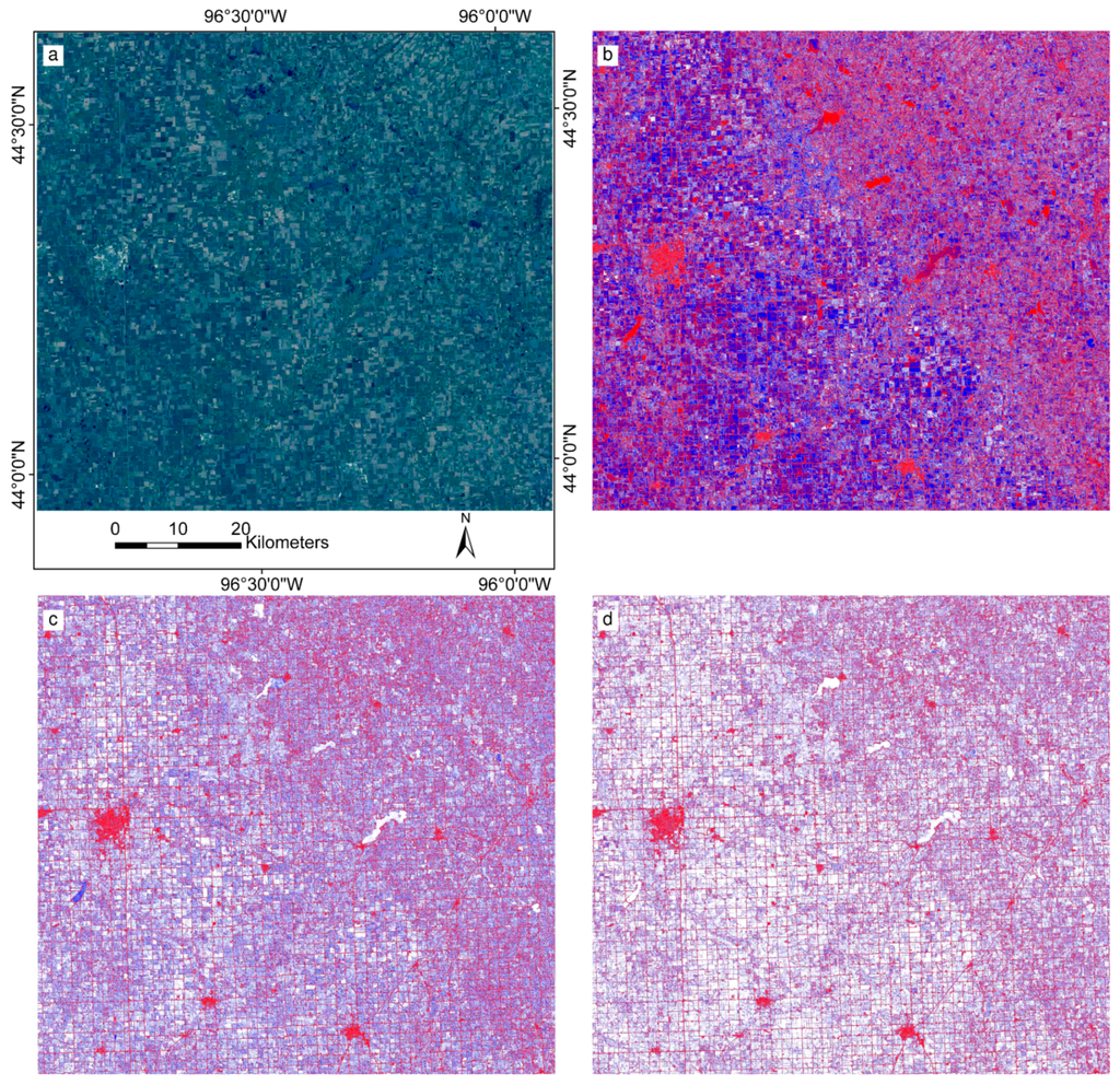Figure 3. South Dakota 2734 × 2532 30 m Landsat 8 top of atmosphere (TOA) red, green, blue TOA reflectance (a). Absolute reflectance differences between the 15m panchromatic band and the 15 m resampled intensity images generated using: the equal spectral weights ( w r e d = w g r e e n = w b l u e = ⅓) (b); the spectral response function based (SRFB) spectral weights ( w r e d = 0.4030, w g r e e n = 0.5177, w b l u e = 0.0802) (c); and the image specific spectral weights ( w r e d = 0.4516, w g r e e n = 0.5981, w b l u e = −0.0588) (d). Absolute reflectance differences colored as: 0 ≤ white < 0.0035, 0.0035 ≤ blue < 0.0070, and red ≥ 0.0070. The 30 m true color and the 30 m intensity images were cubic convolution resampled to the 15 m panchromatic band grid.