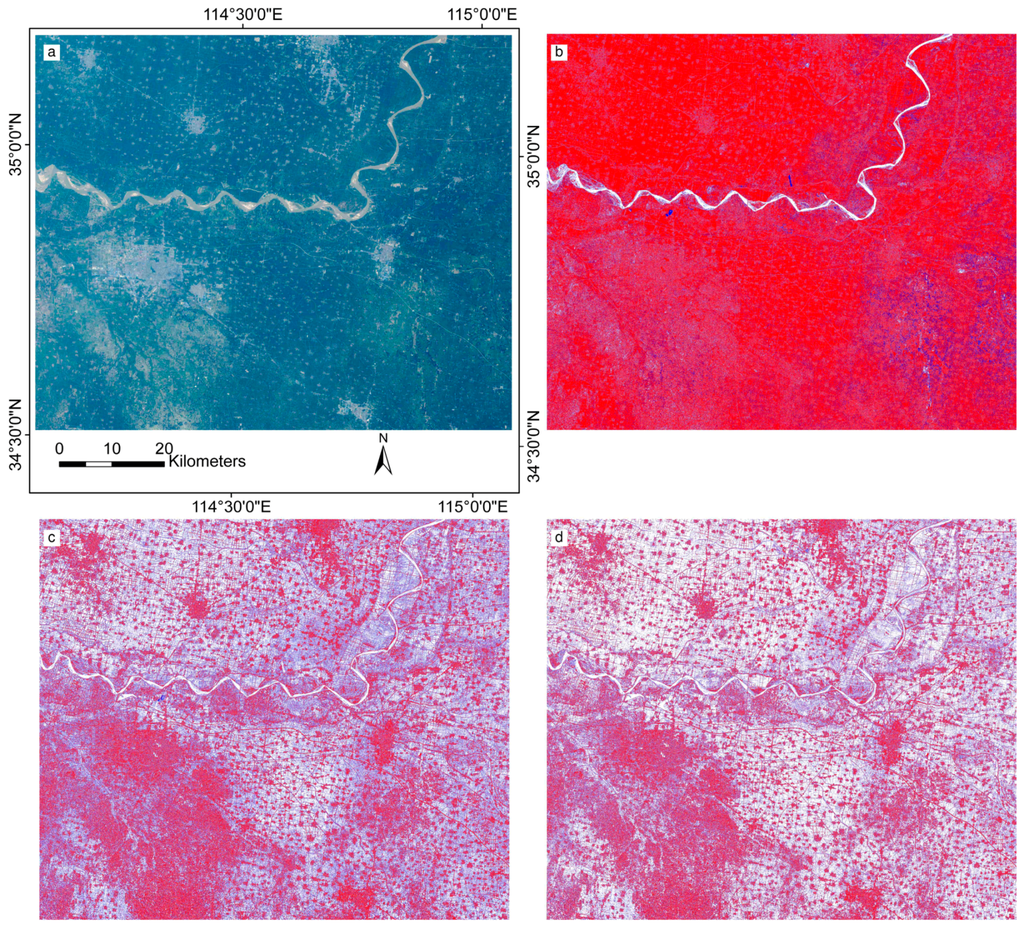 Figure 4. China 2976 × 2520 30 m Landsat 8 TOA red, green, blue TOA reflectance (a). Absolute reflectance differences between the 15 m panchromatic band and the 15 m resampled intensity images generated using: the equal spectral weights ( w r e d = w g r e e n = w b l u e = ⅓) (b); the spectral response function based (SRFB) spectral weights ( w r e d = 0.4030, w g r e e n = 0.5177, w b l u e = 0.0802) (c); and the image specific spectral weights ( w r e d = 0.4568, w g r e e n = 0.5041, w b l u e = 0.0361) (d). Absolute reflectance differences colored as: 0 ≤ white < 0.0035, 0.0035 ≤ blue < 0.0070, and red ≥ 0.0070. The 30 m true color and the 30 m intensity images were cubic convolution resampled to the 15 m panchromatic band grid.