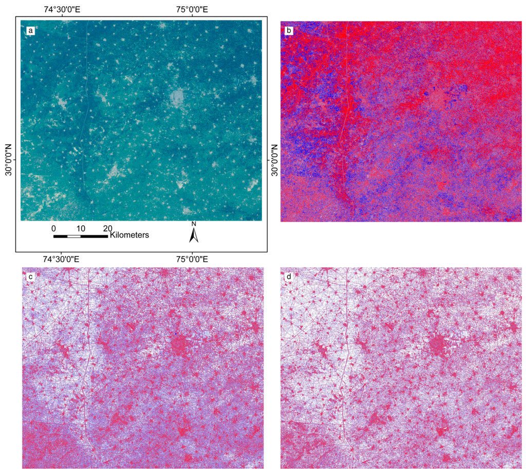 Figure 5. India 2970 × 2470 30 m Landsat 8 TOA red, green, blue TOA reflectance (a). Absolute reflectance differences between the 15 m panchromatic band and the 15 m resampled intensity images generated using: the equal spectral weights ( w r e d = w g r e e n = w b l u e = ⅓) (b); the spectral response function based (SRFB) spectral weights ( w r e d = 0.4030, w g r e e n = 0.5177, w b l u e = 0.0802) (c); and the image specific spectral weights w r e d = 0.4922, w g r e e n = 0.4586, w b l u e = 0.0512) (d). Absolute reflectance differences colored as: 0 ≤ white < 0.0035, 0.0035 ≤ blue < 0.0070, and red ≥ 0.0070. The 30 m true color and the 30 m intensity images were cubic convolution resampled to the 15m panchromatic band grid.