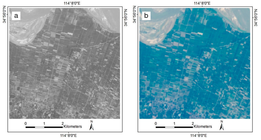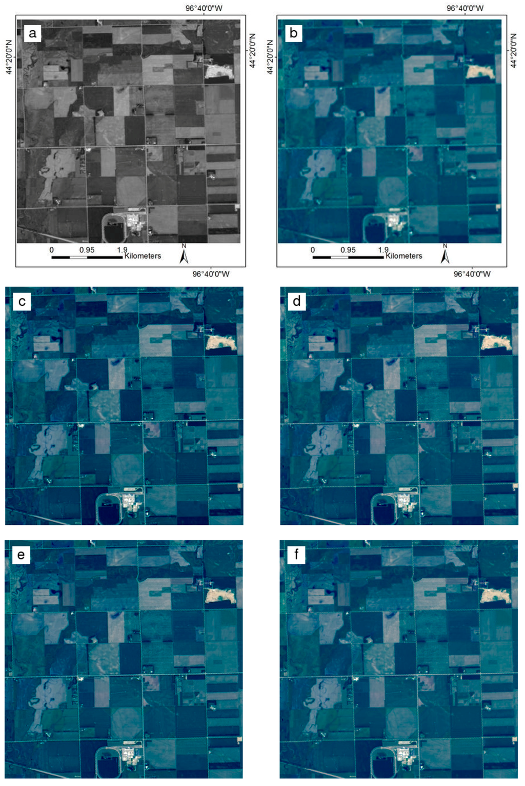 Three largely cloud-free Landsat 8 L1T images acquired over South Dakota, China, and India that provide a range of radiometric and geometric features for testing the pansharpening algorithms were selected. The images were acquired over predominantly agricultural regions, with variable field sizes and patterns, and include settlements and distinct road networks. A single rectangular spatial subset was extracted from each L1T image, ensuring that each subset contained no cloudy pixels and no scene edges. Specifically, spatial subsets with 30 m pixel dimensions of 2734 × 2532 (South Dakota), 2976 × 2520 (China), and 2970 × 2470 (India) were extracted. These data were converted into top of atmosphere reflectance (unitless, range 0–1) using the L1T image metadata.