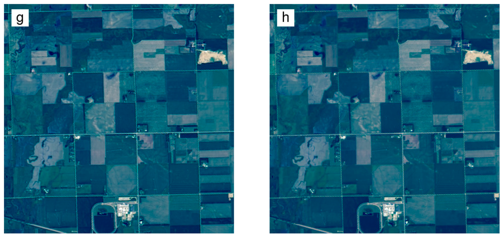 Figure 6. South Dakota illustrative 400 × 400 (15 m) pixel subset. Top row: 15 m TOA panchromatic reflectance (a) and 30 m true color (red, green and blue) TOA reflectance cubic convolution resampled to 15 m (b); The following rows show 15 m true color Brovey (left column) and context adaptive Gramm-Schmidt (right column) pansharpened reflectance respectively, derived using intensity images computed using the equal (c,d); spectral response function based (SRFB) (e,f); and image specific spectral weights (g,h) summarized in the Figure 3 caption.