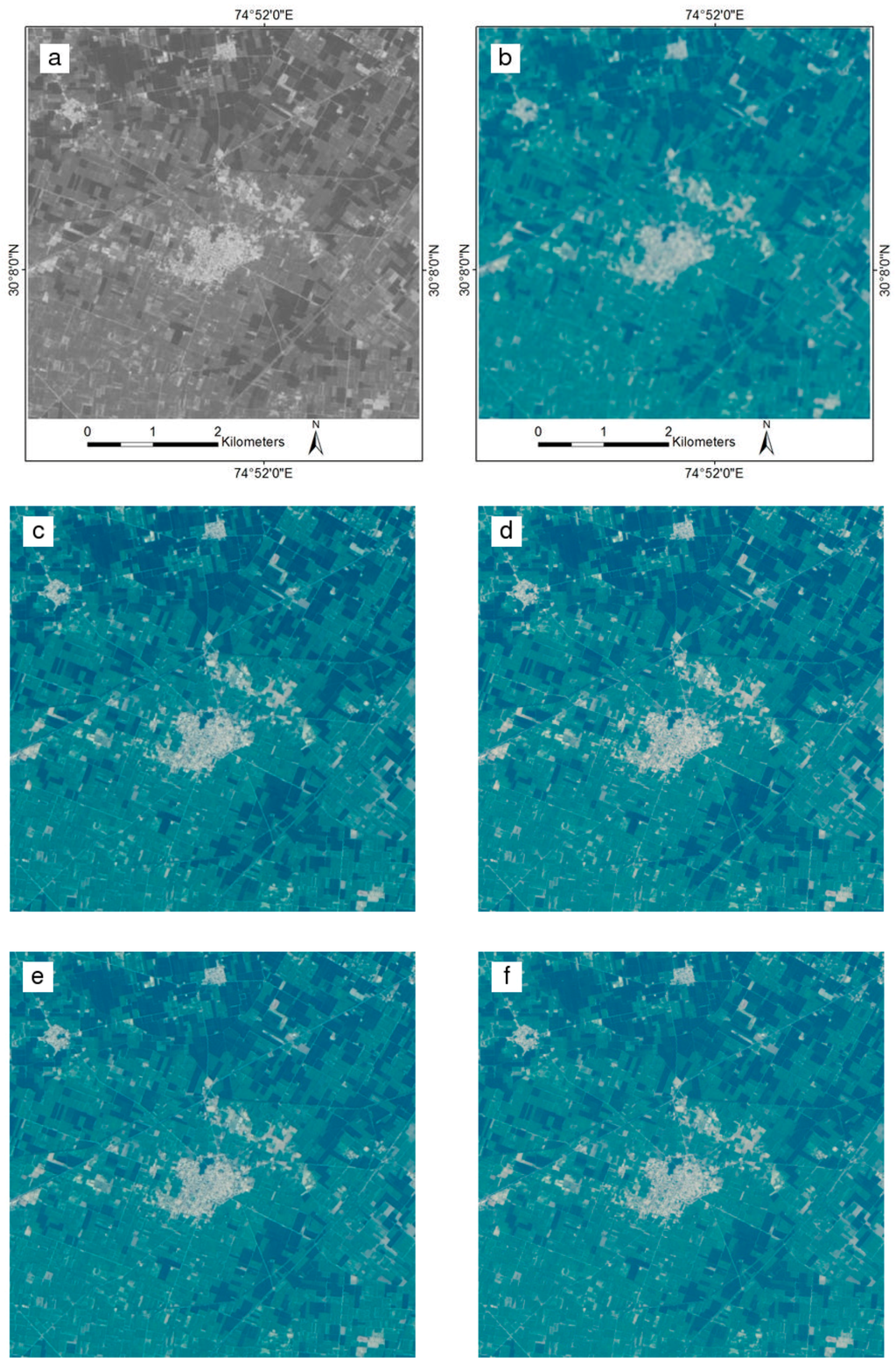 53. Alparone, L.; Wald, L.; Chanussot, J.; Thomas, C.; Gamba, P.; Bruce, L.M. Comparison of pansharpening algorithms: Outcome of the 2006 GRS-S data-fusion contest. IEEE Trans. Geosci. Remote Sens. 2007, 45, 3012–3021. [Google Scholar] [CrossRef]