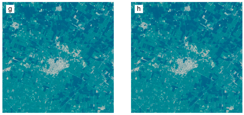 Figure 8. India illustrative 400 × 400 (15 m) subset. Top row: 15 m TOA panchromatic reflectance (a) and 30 m true color (red, green and blue) TOA reflectance cubic convolution resampled to 15 m (b); The following rows show 15 m true color Brovey (left column) and context adaptive Gramm-Schmidt (right column) pansharpened reflectance respectively, derived using intensity images computed using the equal (c,d); spectral response function based (SRFB) (e,f); and image specific spectral weights (g,h) summarized in the Figure 5 caption.