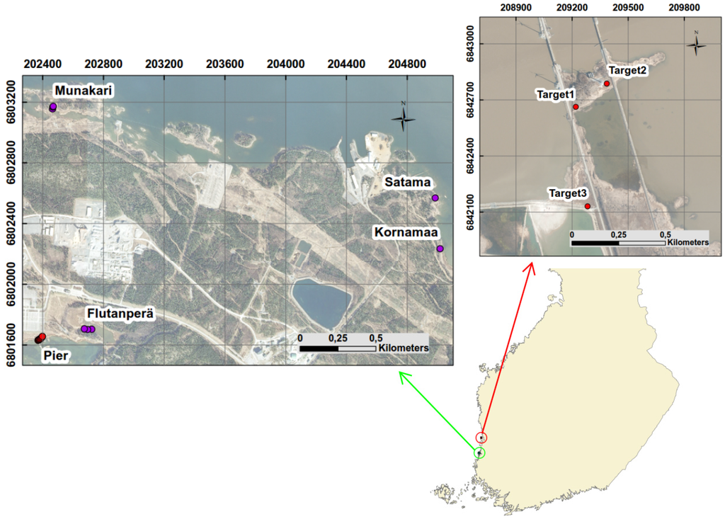 The main study area is located at the Olkiluoto Island (61°14′23.126′′N, 21° 28′55.58′′E) in southwest Finland (Figure 1). The surface area of Olkiluoto is 12 square kilometers and it is separated from the continent by a narrow strait []. Because of long shoreline, coastal ecosystems form a significant part of its nature []. The temporal changes in the environment in the coastal zone are rapid because the surrounding sea areas are shallow. The general eutrophication of the Baltic Sea is contributing to these changes by increasing the amount of organic matter in the shallow bays. Another important factor is the post-glacial land uplift [].