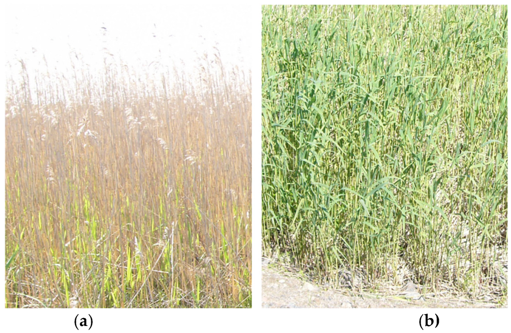 Common reed (Phragmites Australis), a native helophyte in coastal areas of the Baltic Sea, has significantly spread on the Finnish coast during the last decades raising ecological issues and concerns due to the important role it plays in the ecosystem dynamics of shallow coastal areas []. In addition to biodiversity there are other ecological and economic issues such as water protection, bioenergy, construction, farming and landscape. Reed beds have proven to be effective in the treatment of waste waters such as domestic sewage and industrial discharge containing heavy metal wastes []. Reed biomass can be used as an energy source in three ways, namely by combustion, biogas production and biofuel production []. There are currently studies aiming to develop economical and sustainable methods to harvest reed for bioenergy production in Finland. Reed can be used as a soil conditioner in agriculture thus substituting the use of fertilizers [].