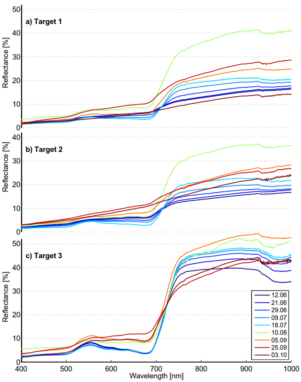 The measured spectra of targets 1, 2 and 3 during the growth period. The measurement dates are shown in the legend. (a) Target 1; (b) Target 2; (c) Target 3.