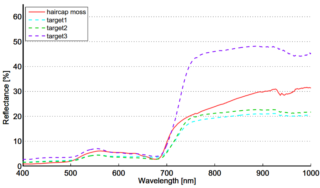 The reference spectrum of haircap moss and the spectra of targets 1–3 measured on 18 July 2012.