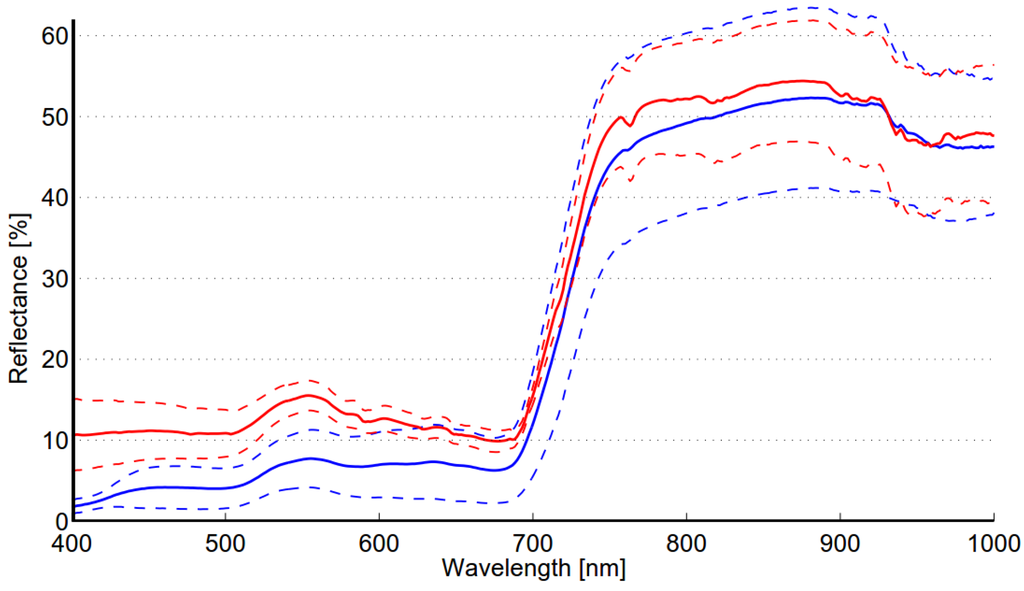 Mean and standard deviation of the reflectance spectra of meadow (blue) and reed bed (red) classes. The standard deviation is presented using dashed lines.