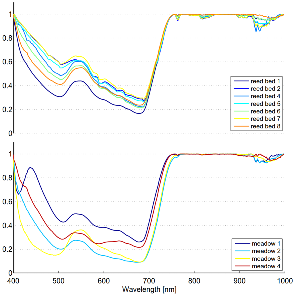 The use of remote sensing in reed bed discrimination has been studied in several publications. Pengra et al. [] evaluated the use of the spaceborne Hyperion sensor. The classification of reed beds showed good overall accuracy of 81.4%. It was found, however, that the small size and spatial arrangement of Phragmites stands was less than optimal considering Hyperion’s spatial resolution of 30 m. Lopez et al. [] studied the discrimination of Phragmites using airborne hyperspectral data collected by the Probe-1 sensor. The study produced Phragmites maps showing an estimated accuracy of 80%. Onojeghuo and Blackburn [] proposed the use of airborne hyperspectral and LiDAR data in reed bed discrimination. A comprehensive set of methods such as Principal Component Analysis (PCA), Spectrally Segmented PCA (SSPCA) and Minimum Noise Fraction (MNF) were applied to the hyperspectral data and combined with LiDAR derived measures including those based on texture analysis. A significant improvement (+11%) in the accuracy of reed bed delineation was achieved when a LiDAR-derived Canopy Height Map (CHM) was used together with the optimal SSPCA data set. Stratoulias et al. [] used airborne AISA Eagle data in order to derive narrow band spectral indices used to characterize reed beds’ ecological status. Seasonal time-series studies can provide important information on spectral variability. Given the dynamic character of vegetation cover, a snapshot in time is not nearly as revealing as a time sequence []. Ouyang et al. [] studied the spectral characteristics of Phragmites and two other wetland species using time-series analysis. The results showed that differences among saltmarsh communities’ spectral characteristics were affected by their phenological stages. Artigas and Yang [] published a field-collected seasonal time-series of Phragmites spectra. The measured spectra were used to determine the vigor gradient of plants in marshlands.