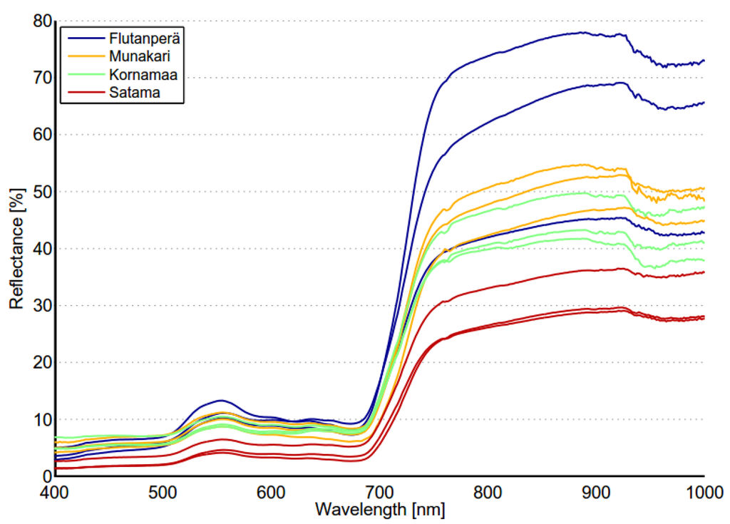 In Figure 7, reed bed reflectance spectra at the four test sites at the Olkiluoto Island are shown. The shape of the measured reed spectra is quite similar in the visible region of the spectrum; however, differences in the near infrared region were remarkable. The measured spectra were quite convergent at sites Munakari and Kornamaa, while the spectra at Flutanpera and Satama differed from those.