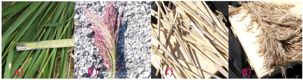 Samples of measured reed components: (a) live leafs; (b) live inflorescence; (c) dead stems; and (d) dead inflorescence.