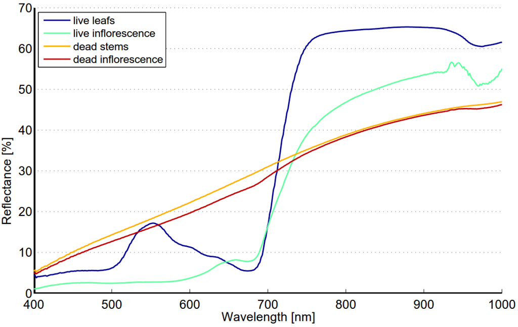 The fundamental problem in vegetation discrimination using remote sensing is that there is an overall qualitative similarity in the spectral reflectance of green plant species. Furthermore, the assumption that individual plant species have unique spectral signatures may be wrong. Price [] has argued that several species may actually have quantitatively similar spectra due to the spectral signature variation present within a species.