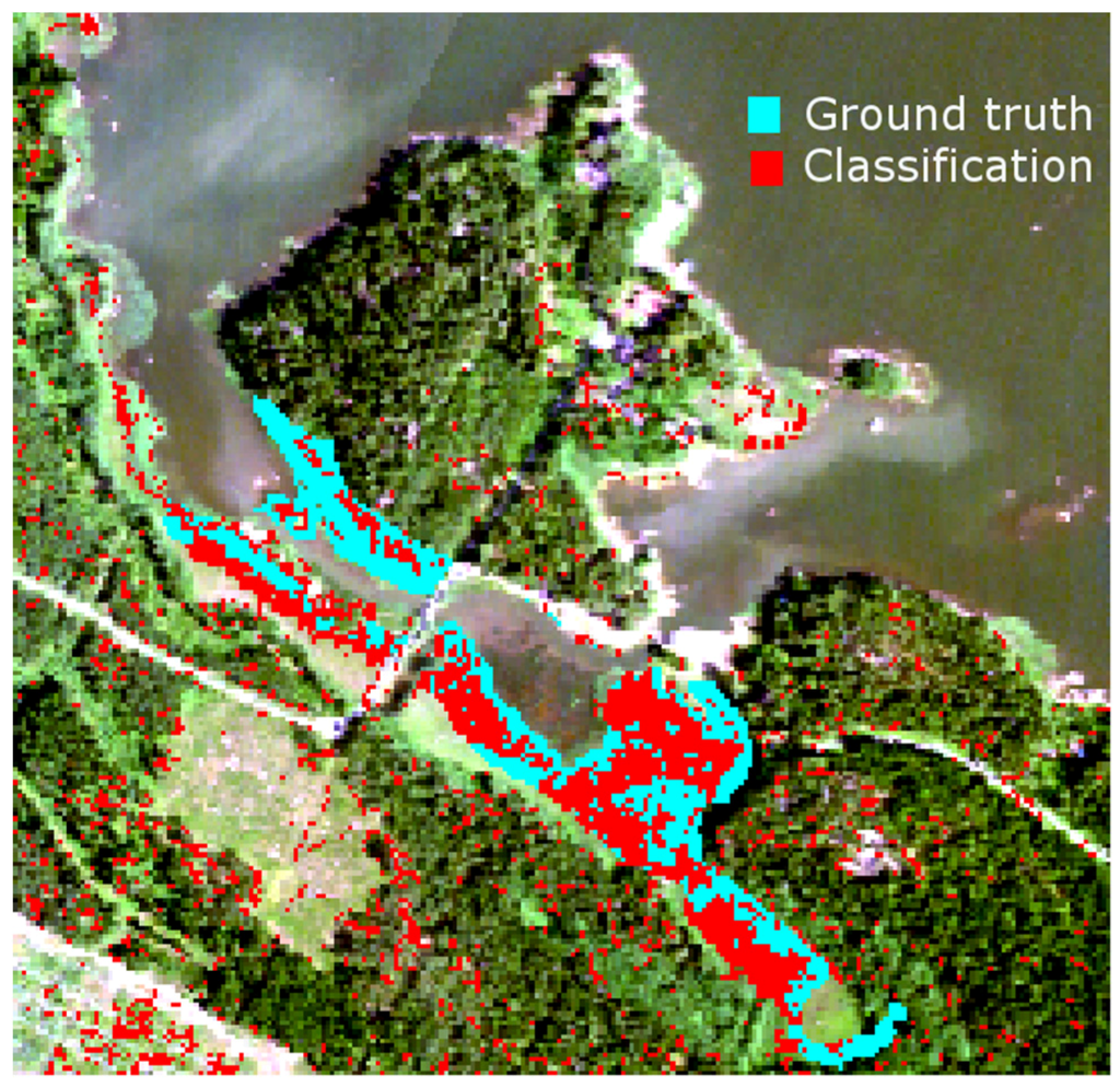 Spectral variability of reed beds within the Olkiluoto Island is significant (see Figure 7). Zomer et al. [] studied the reflectance spectra of dominant wetland species. The measured results of common reed (Phragmites Australis) showed similar shape and high variability as in Figure 7. This suggests that high spectral variability could be common characteristics for reed beds. In order to study spectral variability between reed sites, each site was assigned to a separate class and between-class variability was calculated for each pair of sites. Surprisingly the between-class variability of sites Munakari and Kornamaa (3.85) was lower than local spatial inter-class variability of reed bed at site Pier (15.95). The between-class variability of these two sites was also lower than the variability between spectrally similar Savannah trees []. The highest variability was measured between sites Flutanperä and Satama. This is likely due to remarkable reflectance differences in the NIR region shown in Figure 7. This can be explained by the characteristics of reed beds presented in Table 2. The density and height of dead reed stems is clearly higher at Satama than at Flutanperä. The effects of spectral variability to reed bed discrimination within Olkiluoto Island were studied using airborne hyperspectral data. The accuracy of classification was measured using mean spectra of reed bed sites as a target spectra. Overall accuracy was good, mainly because the other class was much larger than reed bed class, i.e., the relative amount of commission errors stays low. The results of agreement accuracy were modest. This is most likely due to two factors: unfavorable time to separate reed beds from other vegetation and variety of reed bed types present, i.e., old, new and dry reed beds. Conventional remote sensing schemes use one reference spectrum for each species. The results suggest that the use of multiple-endmember approach might be beneficial, agreement accuracy increases when dedicated spectrum is used for reed bed site instead of using one spectrum for the whole island.