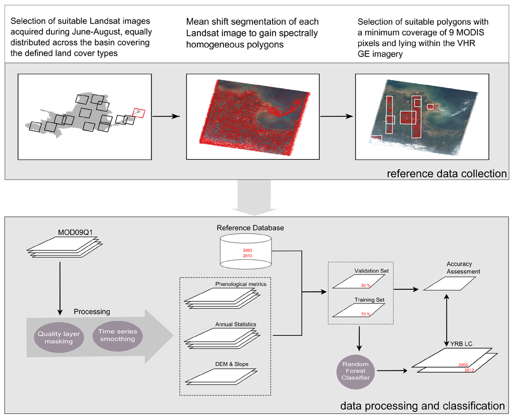 The analytical framework of this study is based on high-temporal, medium-resolution Earth observation data. The data processing and reference data collection procedure is summarized in Figure 2. Seasonal and annual NDVI statistics based on MODIS time series served as input features for the random forest classifier. The two final thematic products were validated using a 30% reference data split. From the derived maps, we detected land cover changes and revealed local land surface dynamics in the last decade, which were examined quantitatively and qualitatively. By comparing local subregions, which are both complex and challenging, with high resolution Landsat imagery, we demonstrate that regional land cover products outperform the available global products.