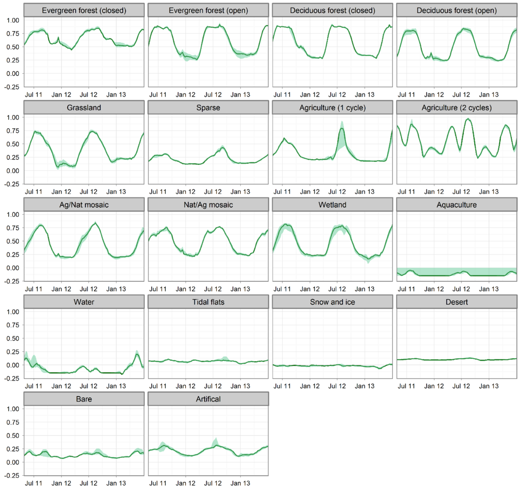 Average temporal NDVI trajectories, derived from 8-day MOD09Q1 data, of all land cover types occurring in the Yellow River Basin (green line) for 3 consecutive years (2012–2014); the light-green shaded area represents the 10th and 90th percentile, respectively.