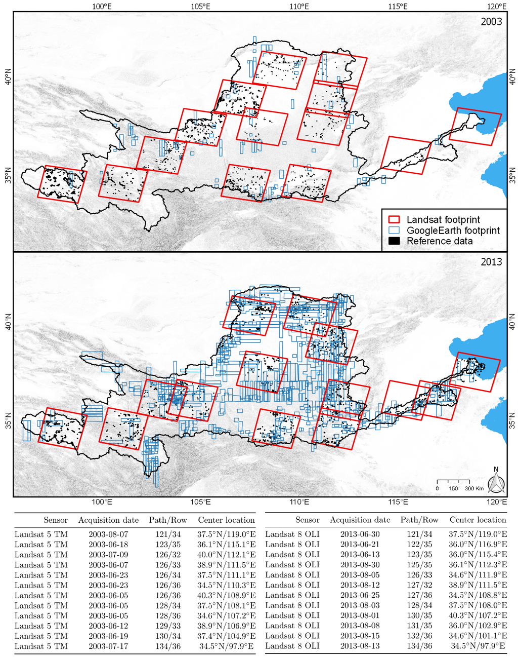 Location and extent of Landsat (red) and very high-resolution (VHR) imagery (blue) footprints for 2003 (top) and 2013 (bottom). The table below shows meta-information for each respective Landsat image.