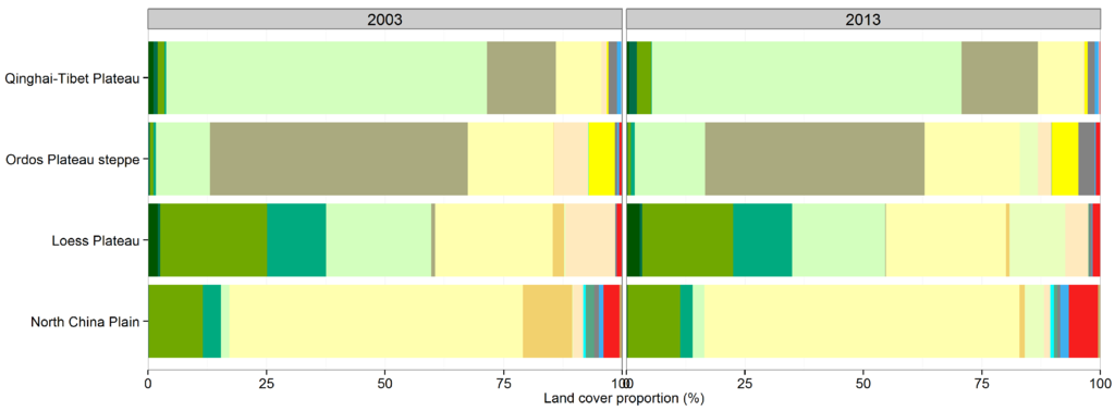 In conclusion, the presented classification scheme we presented, using spectral, seasonal and ancillary information, is a straightforward way to provide an enhanced picture of the prevailing landscape characteristics and dynamics on large spatial scales. To highlight the superiority of the regional-adapted maps, we compared the YRB LC product to the often used global land cover maps and clearly demonstrated that these optimized maps are better suited for depicting regional landscapes. Additionally, multi-temporal information allows for the spatial depiction of trends and recent land change across the Yellow River Basin. The major identified dynamics include agricultural and industrial intensification, as well as growing urban and peri-urban areas. Major conservation policies have considerably shaped the landscape characteristics and improved environmental and ecological conditions in the last decade. The developed highly detailed land cover maps provide essential information to support decision making for sustainable land and water management plans and are of particular interest for national, provincial and local stakeholders. Further, this information can be used as primary inputs for hydrological or climate modeling.