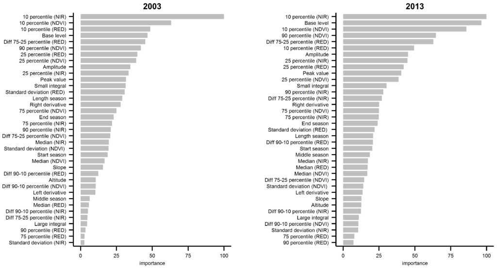 The importance measures for 2003 and 2013 of all 37 MODIS predictors for land cover distinction in the Yellow River Basin are depicted in Figure 8, ordered from most to least important. Both years show similar patterns. The seasonal and small percentiles (10% and 25%) for both spectral bands and NDVI rank amongst the most relevant metrics in delineating the land cover for the basin. Base level, amplitude, peak value and the NDVI integral are found to be the most important seasonal metrics, while left derivative, middle season and the large integral remain least important. Likewise, higher percentiles (50% and 75%), as well as slope and altitude play a minor role in land cover delineation.