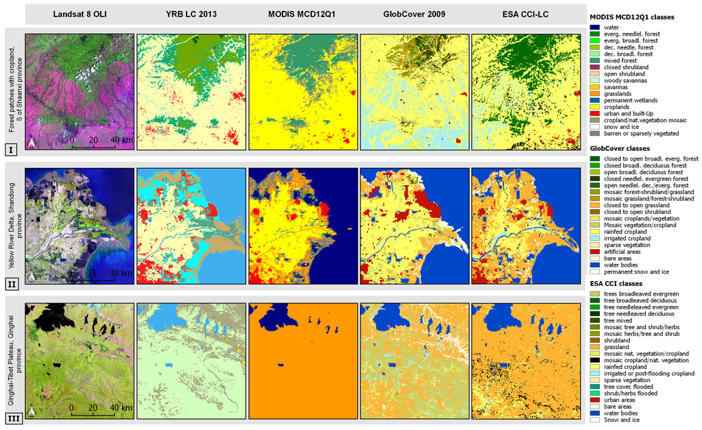 Global land cover products are designed to delineate global land cover patterns, but their suitability for regional applications is not always given. We compare our regional land cover product LC YRB 2013 to the MODIS MCD12Q1 2012 [] (IGBP), the GlobCover 2009 [] and the ESA CCI-LC 2010 []. Further, a high resolution Landsat 8 OLI scene (30 m) from 2013 was taken as reference imagery, showing finer prevailing landscape features in higher spatial detail. For this comparison, we have chosen three subregions, which characterize and represent the major landscape features in the Yellow River Basin determined by rather complex and heterogeneous conditions (Figure 10). The first subset (Row 1 in Figure 10) focuses on a semi-natural and agriculturally-dominated landscape with disjunct forest patches. The Yellow River Delta is the second subset, also a human-dominated landscape with biodiverse wetlands at the river mouth (second row). Further, we selected a rather natural ecosystem, the vast alpine grassland structures on the Qinghai-Tibet plateau presented in Column 3 of Figure 10. The geographical extent and distribution of each subregion is depicted in Figure 6.