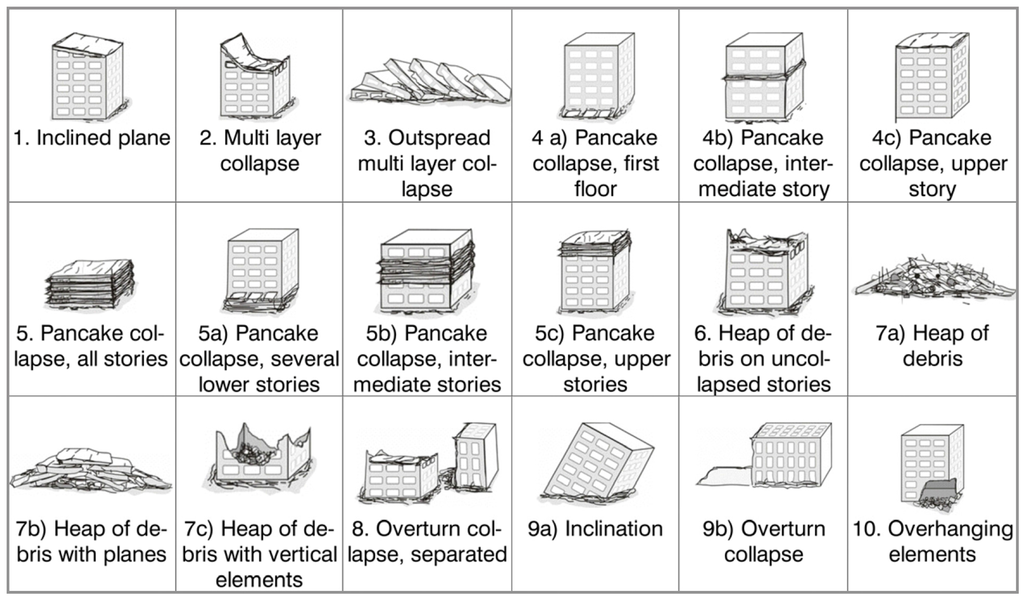 This paper categorizes the building damage catalog into two categories based on geometry features of roofs including debris and the roof structure. The first category, named surface damages, contains damaged building with debris surfaces such as multilayer collapse (2), top story pancake collapse (4c, 5, 5c), heap of debris (6, 7a, 7c) and heap of debris with planes (3, 7b). The second category, named structural damages, contains damaged buildings with relatively intact surfaces and includes inclined plane (1), middle or lower story pancake collapse (4a, 4b, 5a, 5b) and inclination (9a). Pancake collapse is a damage type of concern. The top story pancake collapse types, including damage types 4c, 5 and 5c, can be detected using post-event airborne LiDAR point clouds because the roofs are collapsed or damaged, whereas middle or lower story pancake collapses, including damage types 4a, 4b, 5a and 5b, are difficult to detect because the roofs are nearly intact. However, few perfect middle or lower story pancake collapses wherein the building entirely maintains its surface and structure during destructive earthquakes occur; the majority of buildings exhibiting this type of pancake collapse usually exhibit an inclination as well []. Therefore, this form of pancake collapse can be detected through the structure analysis of inclination.