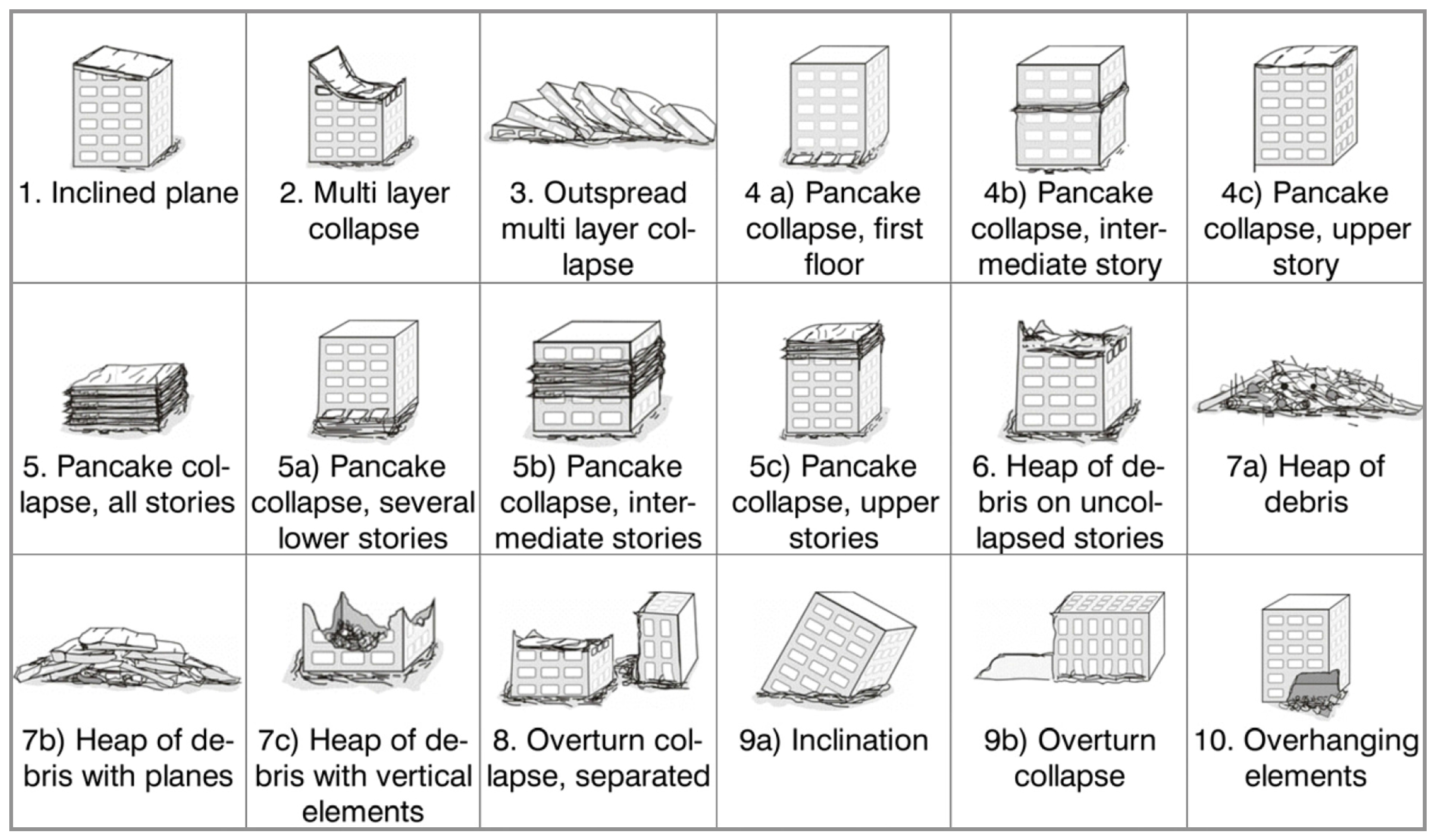 This paper categorizes the building damage catalog into two categories based on geometry features of roofs including debris and the roof structure. The first category, named surface damages, contains damaged building with debris surfaces such as multilayer collapse (2), top story pancake collapse (4c, 5, 5c), heap of debris (6, 7a, 7c) and heap of debris with planes (3, 7b). The second category, named structural damages, contains damaged buildings with relatively intact surfaces and includes inclined plane (1), middle or lower story pancake collapse (4a, 4b, 5a, 5b) and inclination (9a). Pancake collapse is a damage type of concern. The top story pancake collapse types, including damage types 4c, 5 and 5c, can be detected using post-event airborne LiDAR point clouds because the roofs are collapsed or damaged, whereas middle or lower story pancake collapses, including damage types 4a, 4b, 5a and 5b, are difficult to detect because the roofs are nearly intact. However, few perfect middle or lower story pancake collapses wherein the building entirely maintains its surface and structure during destructive earthquakes occur; the majority of buildings exhibiting this type of pancake collapse usually exhibit an inclination as well [36]. Therefore, this form of pancake collapse can be detected through the structure analysis of inclination.