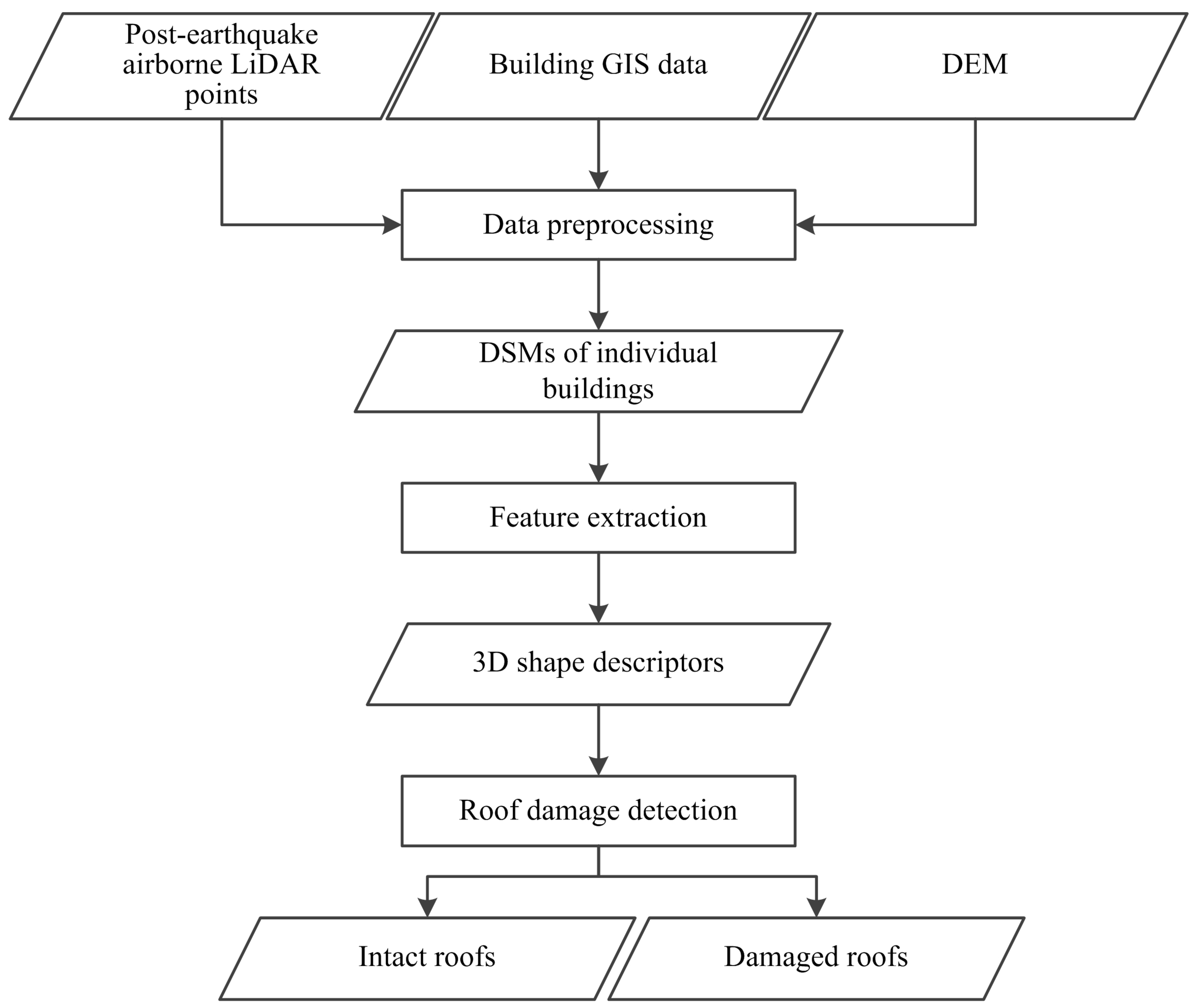 In this paper, the detection of damaged roofs is based on damage interpretation using post-event airborne LiDAR data. The process includes three key procedures: data preprocessing, feature extraction and damaged roof detection. Five algorithm parameters, as shown in Table 1, are estimated experimentally or automatically during the workflow, which will be discussed in the Section 4.3.