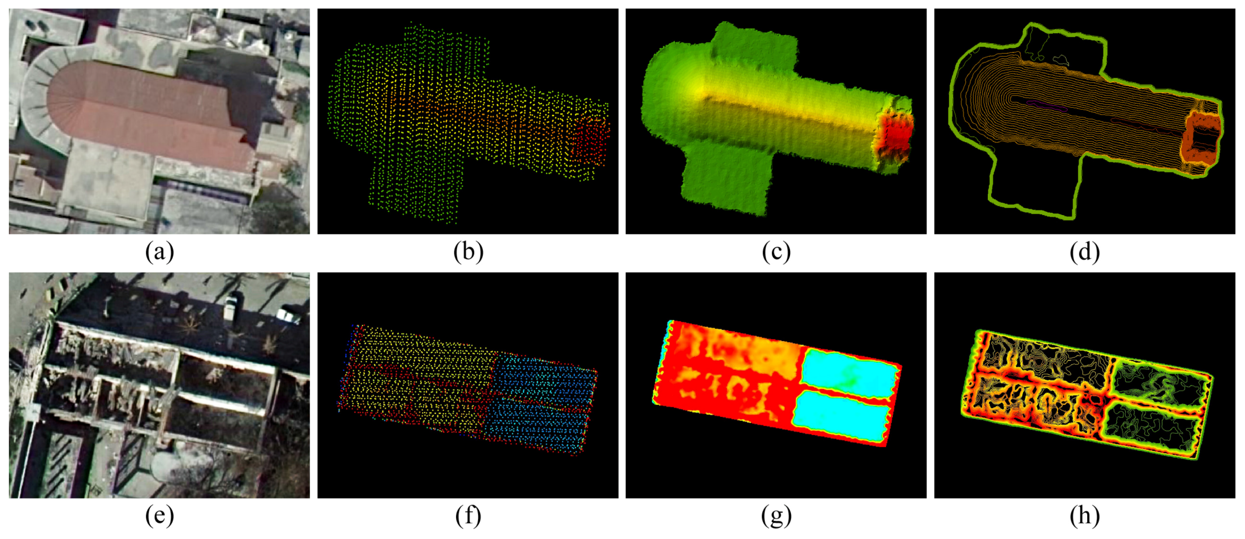 The data processing samples: (a) The image of an intact building with an arched roof; (b) The airborne LiDAR point cloud; (c) The dense DSM; (d) Contour clusters colored with different colors; (e) The image of a completely collapsed building with intact walls; (f) The airborne LiDAR point cloud; (g) The dense DSM; (h) Contour clusters colored with different colors.