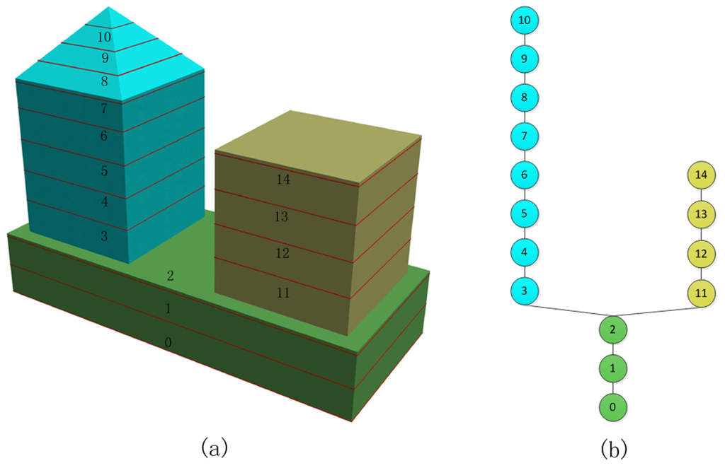 Three building surface regions belonging to different structures are segmented by three contour clusters and are different colors: (a) Contours of the building; (b) Contour clusters of different structures that are represented as nodes colored with the same color in a contour tree.