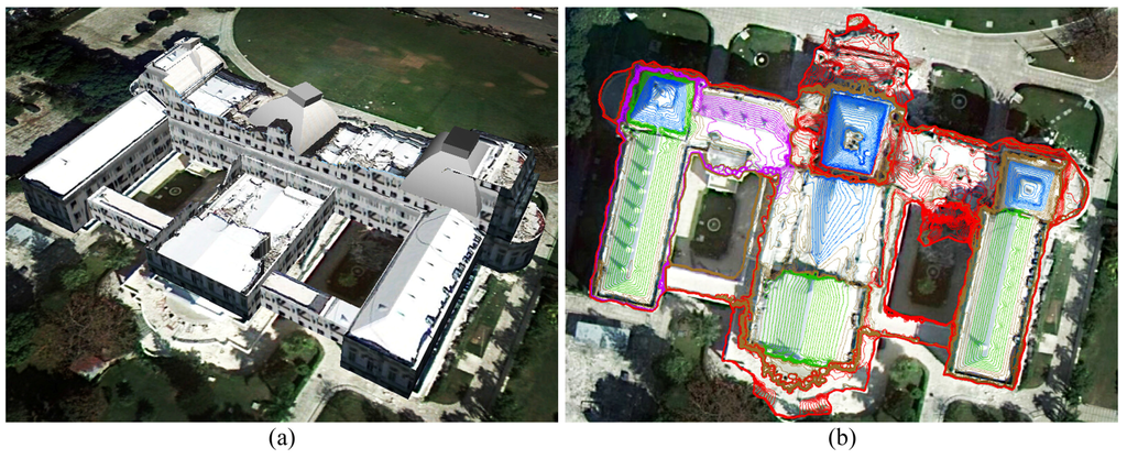 The spatial patterns of complex roof surfaces are represented by contour clusters: (a) The complex surface of Haiti’s National Palace, which was destroyed in the 2010 Haiti earthquake (obtained from Google Earth); (b) Contour clusters of the roof are rendered in different colors according to different surface or structural morphologies, such as contours of surfaces with debris (red), twisted surfaces (purple) and inclined roof structures (blue), which are jagged or irregular, and contours of intact surfaces and structures (green) are compact and regular.