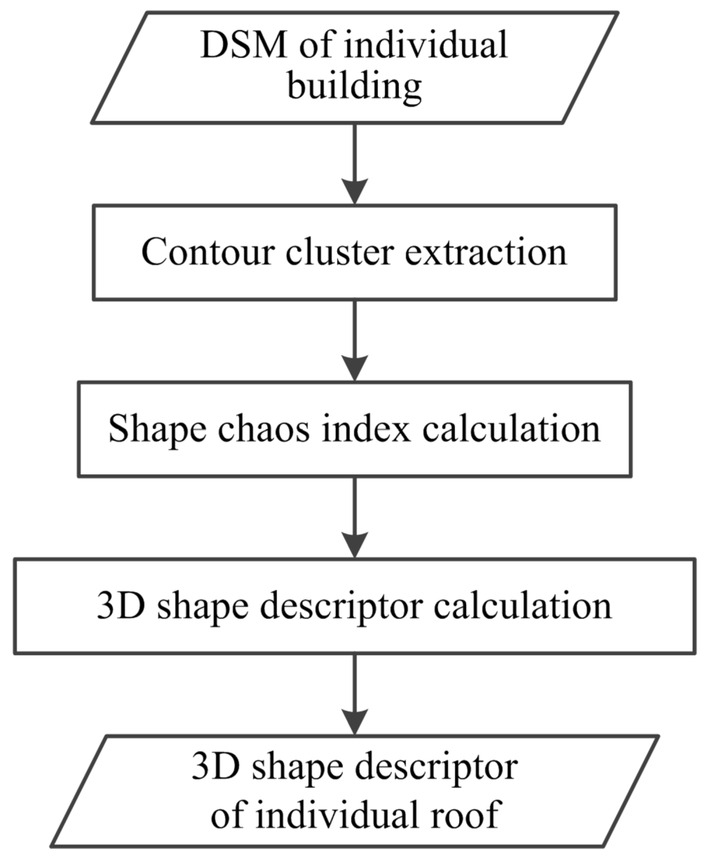 This paper proposes a feature extraction algorithm for a 3D shape descriptor based on the shape analysis of contour clusters. There are three key procedures in the feature extraction algorithm: the contour cluster extraction, the shape chaos index calculation and the 3D shape descriptor calculation. Contour clusters are extracted from the contour tree, which is built using relationships based on the containment method for contours generated from the DSM. The shape chaos index of the contour cluster is calculated based on the information entropy of shape similarities, which are computed based on the shape similarity measurements among contours. The 3D shape descriptor is calculated based on the shape chaos indexes. Figure 6 shows the complete workflow of the feature extraction algorithm.