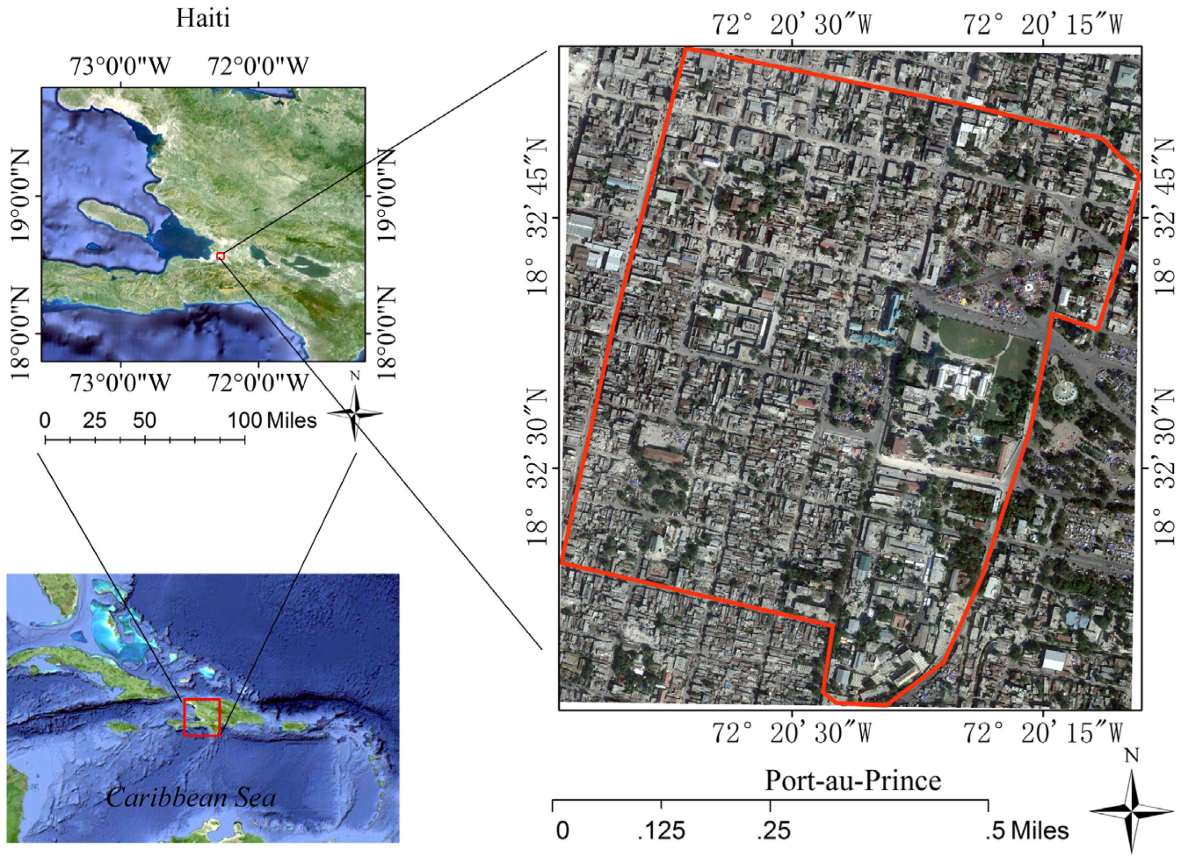 The study area (Figure 7) is located in the area surrounding Haiti’s National Palace, Port-au-Prince, Haiti. The site is approximately 776,660 square meters of flat terrain with dense buildings. On Tuesday, 12 January 2010, Haiti was hit by an earthquake that struck nearly 15 miles from Haiti’s capital, Port-au-Prince. According to official estimates, 316,000 people were killed, 300,000 were injured, 1.3 million were displaced, 97,294 houses were destroyed, and 188,383 houses were damaged in the Port-au-Prince area and in much of southern Haiti [71]. Many buildings in the study area were destroyed by the earthquake.