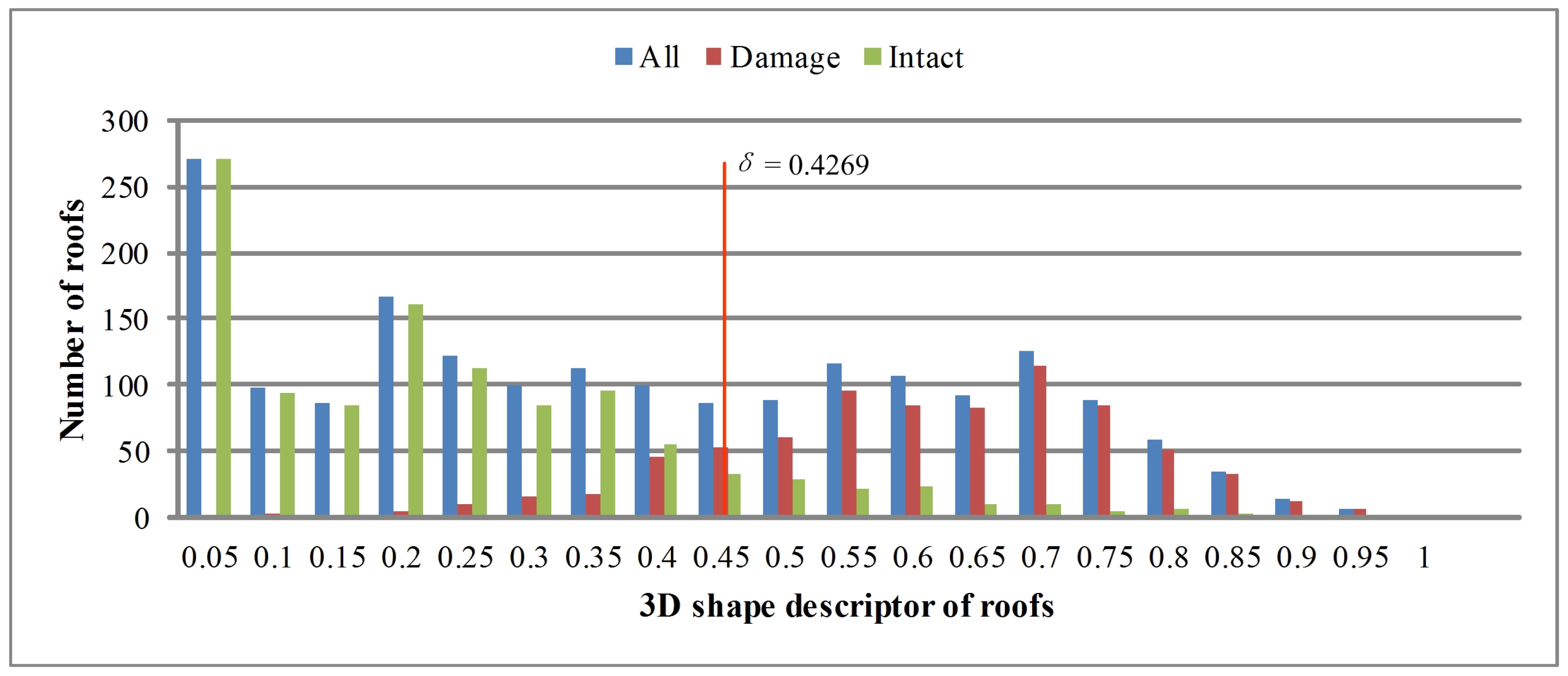 The distribution of all intact and damaged roofs based on the 3D shape descriptor and the shape similarity threshold δ. The damage information of roofs is from the reference data.